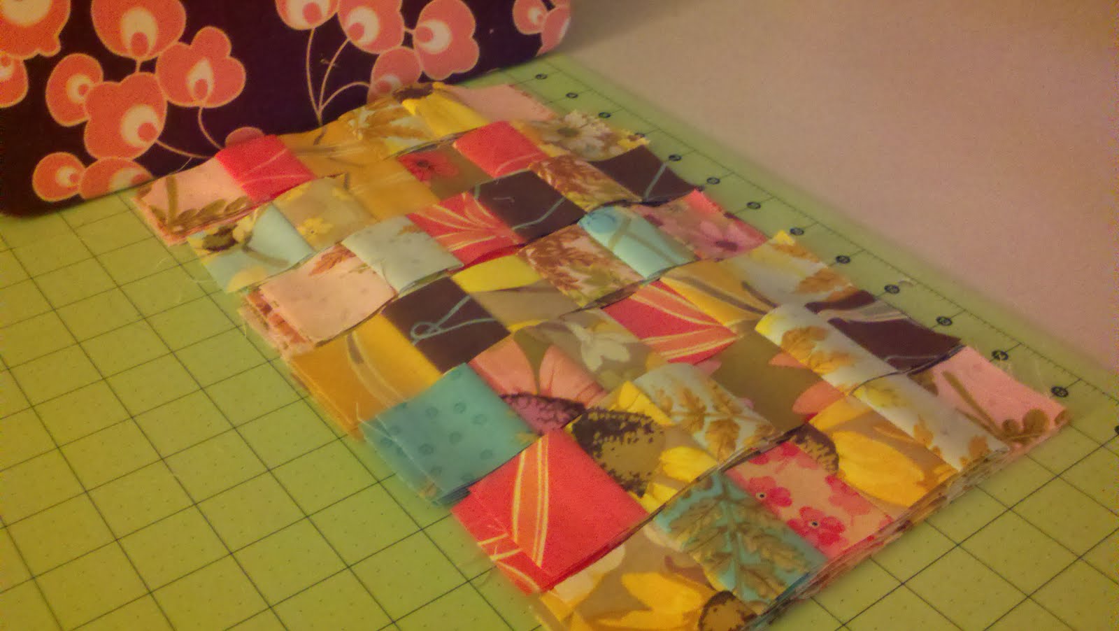 I'm really going to make time to do this now. I've moved away from my beloved craft group, and this is going to be a great way to connect with them through the 2,000 mile drive. :) My latest project is for a wedding I'm attending this weekend. With a some sort of miricle I should be able to finish it in time. I've made some great progress so far. I took the idea of the bits and peices quilt from Last minute patchwork and quilted gifts and expanded on it. Here are some action shots for those fabric porn lovers.